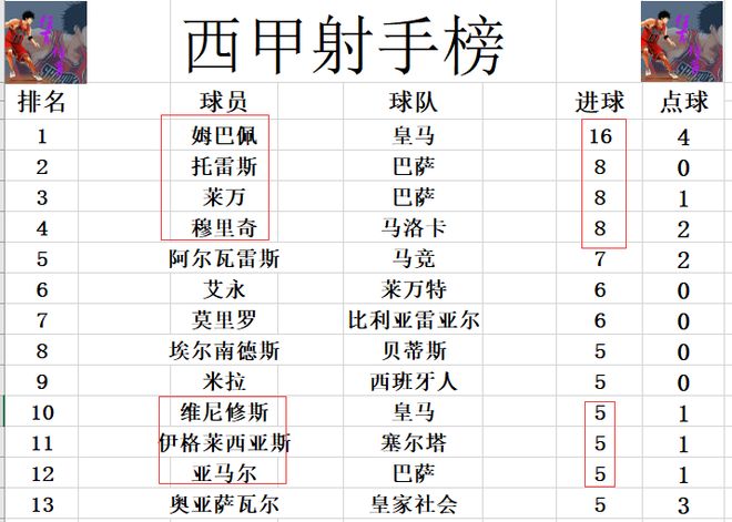 射手榜方面,姆巴佩今天2射1传独造3球,再次扩大了领先优势,进球数已经是排名第2的莱万,托雷斯,穆里奇等人的两倍。阿尔瓦雷斯7球排在第5,维尼修斯今天错失良机没有进球,还是和亚马尔,伊格莱西亚斯等人5球刚好挤入前十。