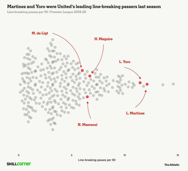 一旦完全康复,马丁内斯很可能跻身英超最好的向前传球手之列,能够通过聪明的虚晃和精准的左脚传球来穿透防线。如果阿莫林及其教练团队愿意,他们可以开始将曼联早期组织构建的一部分比例交给马丁内斯来主导,从而减少门将拉门斯向中场送出的长传比例。
